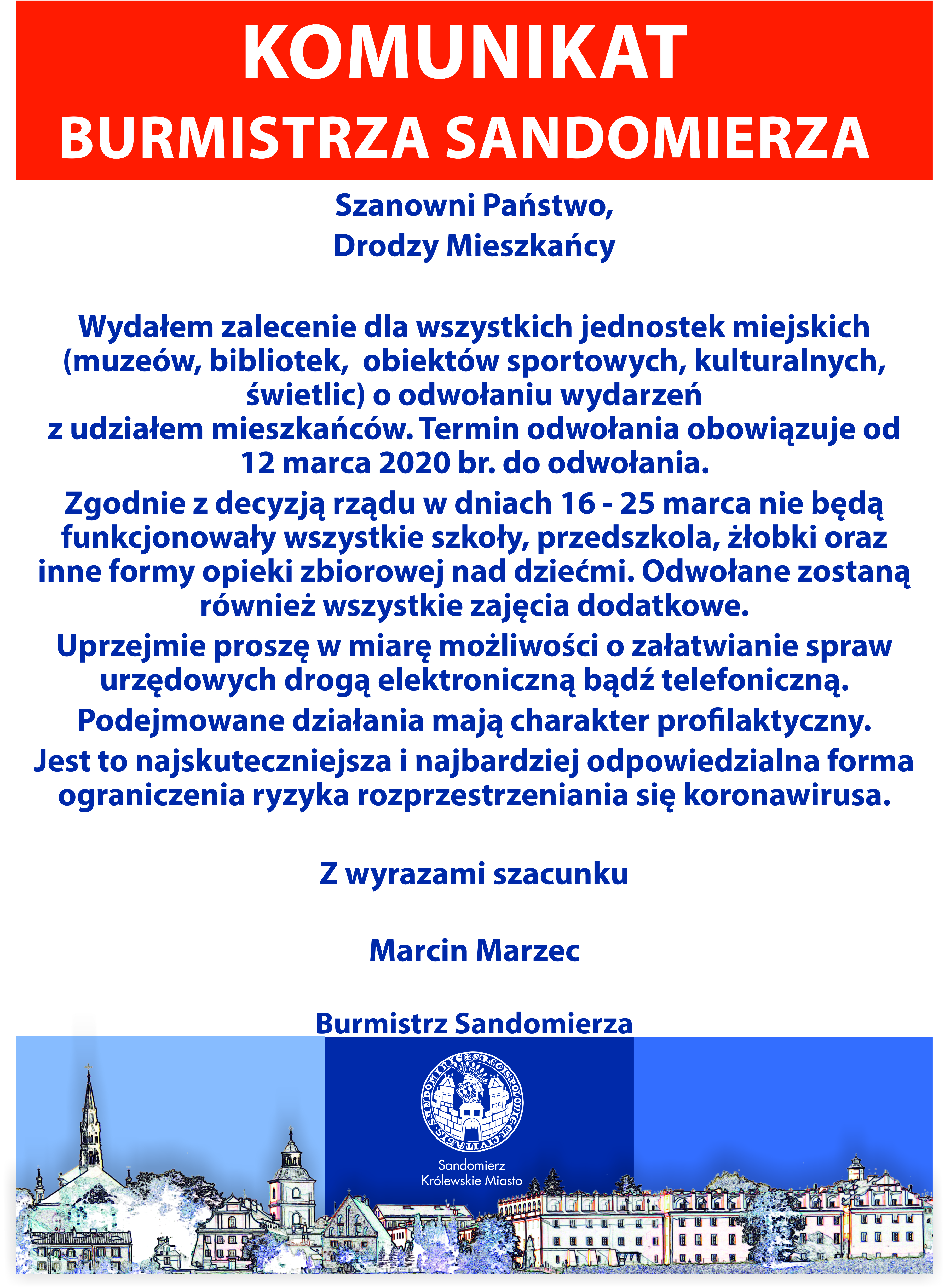 KORONAWIRUS - Komunikat Burmistrza Miasta Sandomierza dla Mieszkańców Sandomierza (wygasły...)