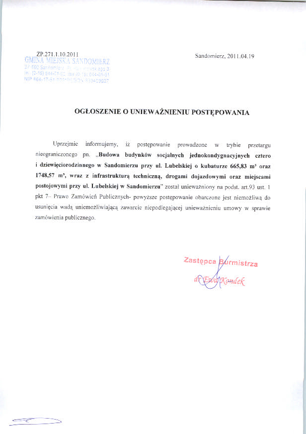 dot. postępowania prowadzonego w trybie przetargu nieograniczonego pn. „Budowa budynków socjalnego jednokondygnacyjnych cztero i dziewięciorodzinnego w Sandomierzu przy ul. Lubelskiej o kubaturze 665,83 m³ oraz 1748,57 m³, wraz z infrastrukturą techniczną, drogami dojazdowymi oraz miejscami postojowymi przy ul. Lubelskiej w Sandomierzu